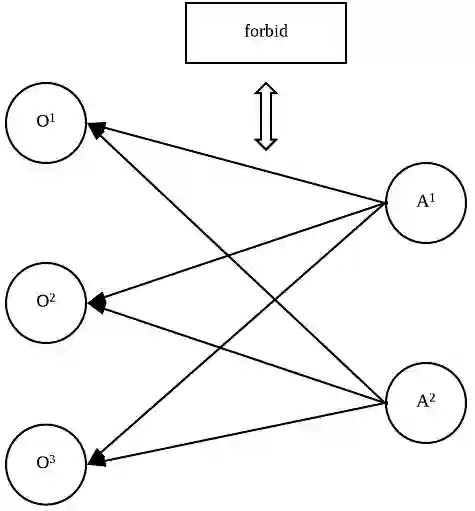 社会的规范可以包含很多方面,对于以机器人-物品互动为中心的权限,最主要的就是禁止(forbid)对某件物品进行动作。因此在文章中的权限,主要指 allow 和 forbid 两种权限处理,以谓语逻辑进行表示,就是 和