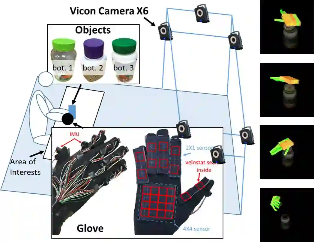 文章采用了双臂 7-DoF Baxter 机器人。整个系统在 ROS 上运行。收集手部姿势时使用开放式触觉手套和力数据,该手套配备有 i)15 个 IMU 的网络以测量各个趾骨之间的旋转,以及 ii)使用 Velostat(一种压阻材料)的 6 个定制力传感器来记录 每个趾骨上的两个区域(近端和远端)的力和手掌上的 4×4 区域。手腕和手腕部分(即瓶子和盖子)之间的相对姿势是从 Vicon 获得的。数据收集过程如下图所示。