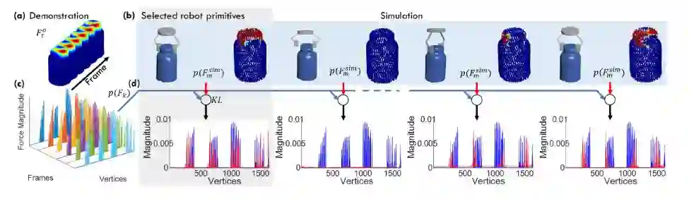 为了让机器人学习动作镜像但又避免过度模仿,文章利用了基于物理的 Neo-Hookean 模型模拟器对学习出来的模型进行测试。镜像动作首先通过模拟下的力分布来操作,然后与学习得出的力分布进行比较。然后选择与学习的力的概率分布的最小距离的动作(如下图所示)。在本文中使用 KL 散度作为距离度量。