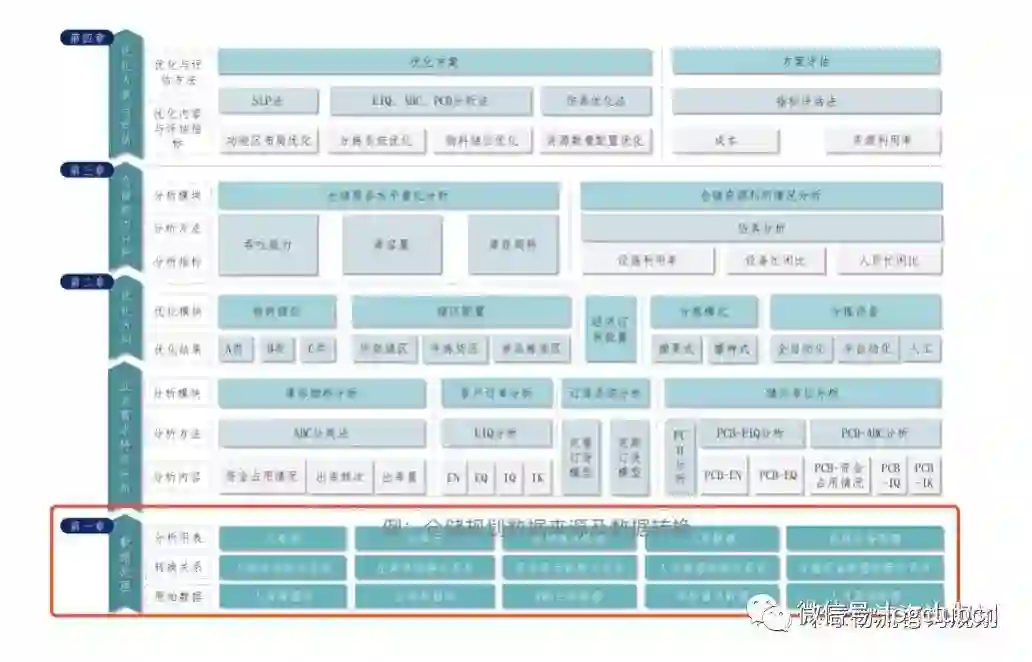 以仓储规划为例,其主要内容可以分为:仓储中设施布局、流程配置、人员配置、设备配置四个方面,这四个方面都有相对应的规划分析方法。