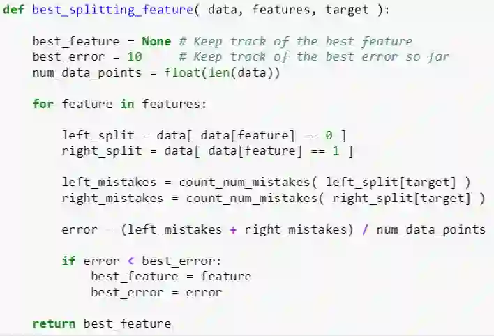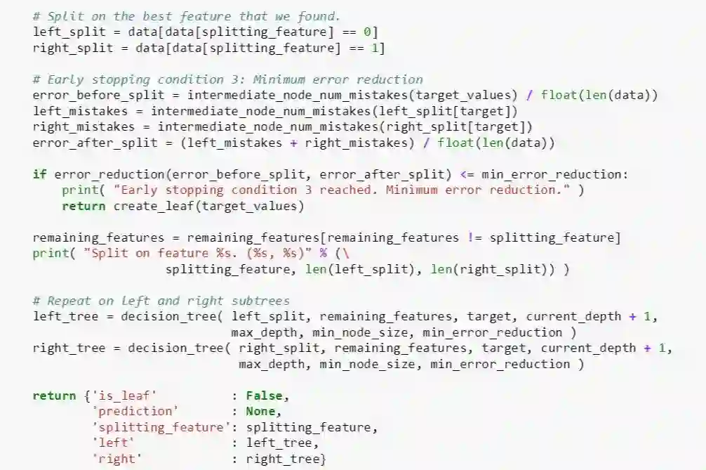用 best_splitting_feature 找到最佳特征,并分裂成左子树和右子树,如果 error_reduction 返回值小于 min_error_reduction,创建叶子 (提前停止条件 3)。同时将最佳特征从 remaining_features 删除