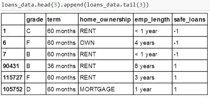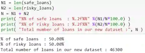 首先计算出好坏贷款的个数,并计算出它们的比例 ratio,由上节结果知道好贷款比坏贷款多 (大概 4 倍左右),因此在好贷款中随机选取 1/4 和原先的坏贷款组成 (用 append() 函数) 新的贷款数据。这是一种欠采样的方法,即去除一些正例使得正反例数目相近,然后在进行学习。但是欠采样法可能会丢失一些重要信息。业界通常用集成学习机制 (ensemble method),将正例划分给几个集合供不同模型使用,这样对每个模型来看都是欠采样,但在全局来看确不会丢失重要信息。在本贴重要是为了平衡化样例类别,就不深究那些复杂采样的方法了。