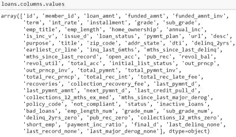 而用 columns.values 函数可以看到 loans 里面有那些具体特征。