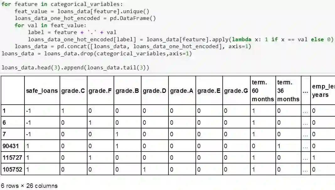 独热编码是一种把分类字符型变量转换成 0/1 数值型变量的技巧,比如对 home_owernship 特征来说,它对应特征值只包含 RENT, OWN 和 MORTGAGE 这三个。