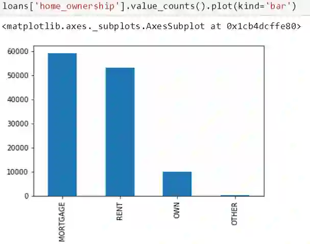 以上代码里 value_counts() 是对每个房屋所有权里的数据做计数,而 plot(kind='bar') 是将这些计数用条形图画出来。从上图可知只有一小步部分房屋是被完全拥有的。