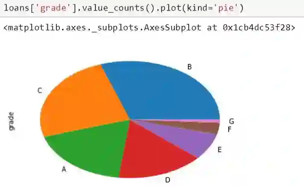 以上代码里 value_counts() 是对每个评级里的数据做计数,而 plot(kind='pie') 是将这些计数用饼状图画出来。从上图可知评级为 B 和 C 的两类贷款占了全部贷款的一半。