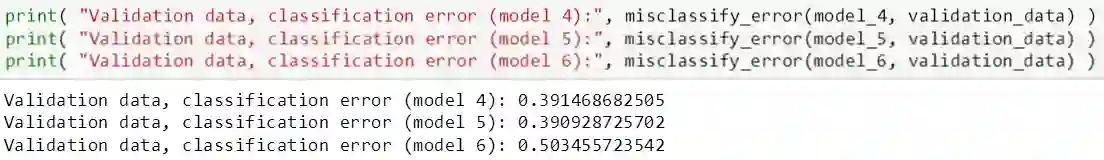 模型 4 和 5 的验证误差相似 (模型 6 的验证误差相比太大),但是它们的叶子数分别是 38 和 13,由此看出模型 4 比模型 5 要复杂。