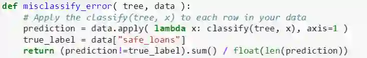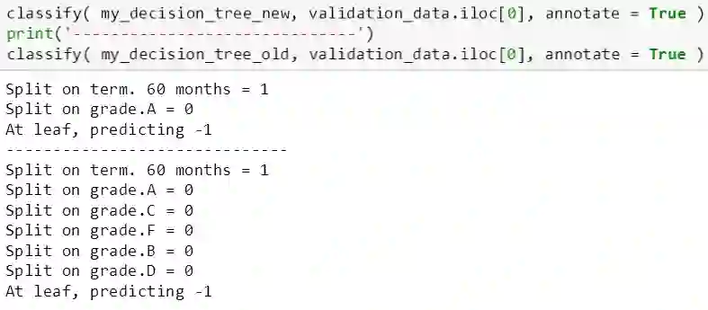 用上一章 classify 函数来看看分类结果,很明显新树只需要 2 次分裂就能到达叶节点来预测这笔贷款是恶性贷款;而老树需要 6 次分裂才能预测它是恶性贷款。