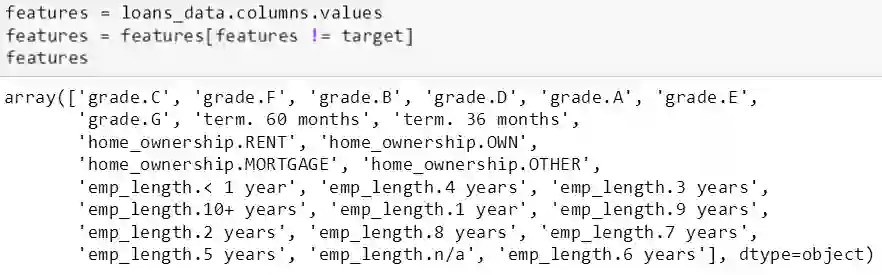 下面代码是找出 loans_data 里面所有非数值型特征值对应的特征,本例的四个特征都属于此类而被找出。