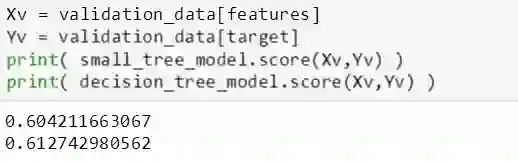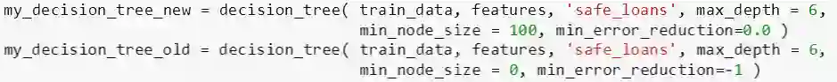 接着斯蒂文用上面程序训练了两棵树 (新树和老树),它们的区别是 min_node_size (100 和 0) 和 min_error_reduction (0 和 -1),很明显新树不容易过拟合,因为它允许叶节点包含的数据个数是 100 个,而且不允许分裂后的误差小于 0 (即不允许分裂后误差增大)。