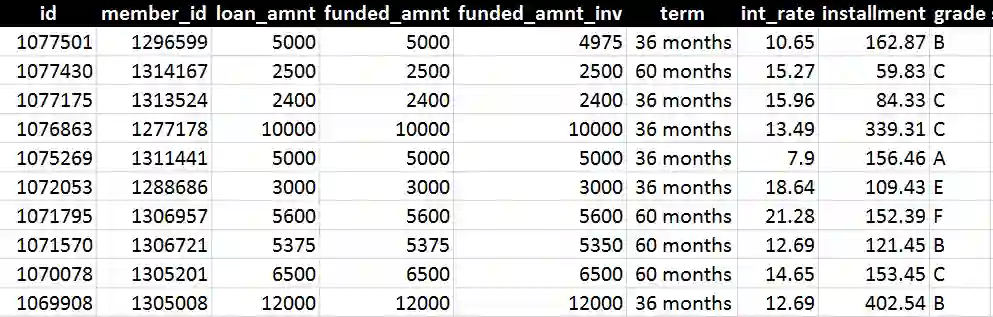 上图记录着一些重要特征如 loan_amount, term, int_rate 和 grade,分别指是贷款本金、年限、利率和评级。