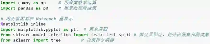 此外 train_test_split 是用来划分训练和测试集,而 tree 是 sklearn 自带的决策树模型,可以直接拿来用。