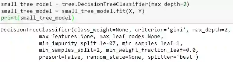 斯蒂文用 DecisionTreeClassifier 函数来建立两个树模型,最大树深 (max_depth) 分别是 6 层和 2 层,因此第一棵树 (适中树) 比第二棵树 (简单树) 复杂。然后用 fit() 函数来拟合 X 和 Y 生成树模型。从打印树的信息可看出,该模型用的是基尼指数 (gini) 来划分特征。