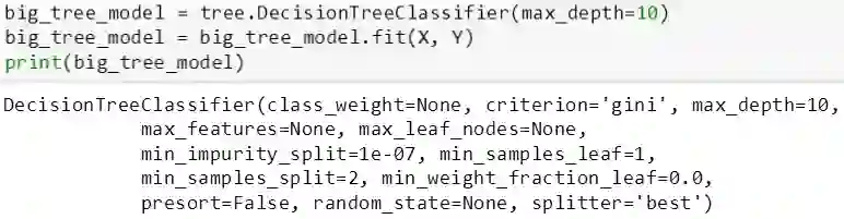 用 score() 函数来评估树的分类准确率,由上图可知,适中树比简单树的训练误差和验证误差低 (准确率高)。接下来用最大树深 10 层来生成一棵复杂树,如下: