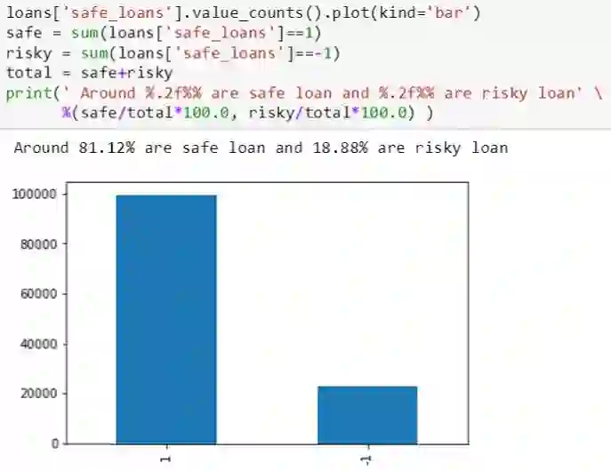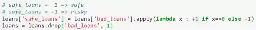 csv 里面有一栏 (标签) 叫 bad_loans,其中 0 代表良性贷款 1 代表恶性贷款。本章用 -1 和 1 代表良性贷款和恶性贷款。以下的代码将 bad_loans 的 0 和 1 转换成 safe_loans 的 1 和 -1。