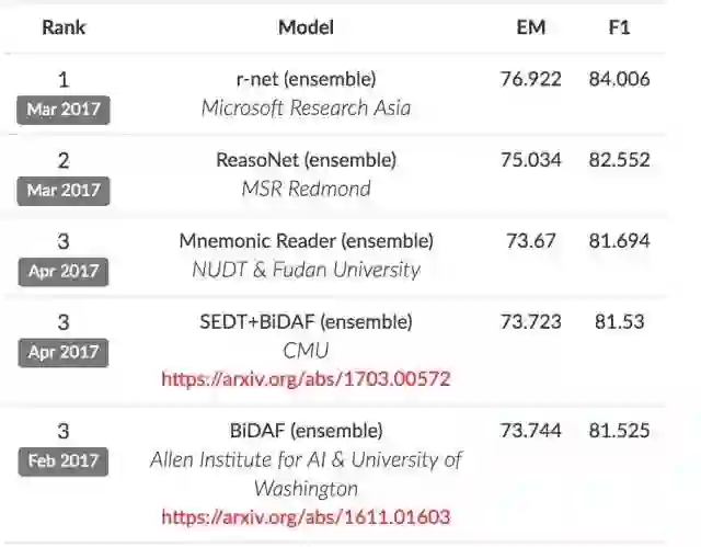 SQuAD 数据集是机器阅读这一新兴领域的核心基准,许多顶尖的学术或产业团队都在使用它测试自己的系统。它类似于 ImageNet 竞赛,激励着计算机视觉的发展。此外,微软研究员和其他来自学界、产业界的团队也在使用另一个数据集 MS MARCO 进行激烈竞争,MS MARCO 数据集使用来自 Bing 搜索词条的真实、匿名数据来测试系统回答问题的能力。