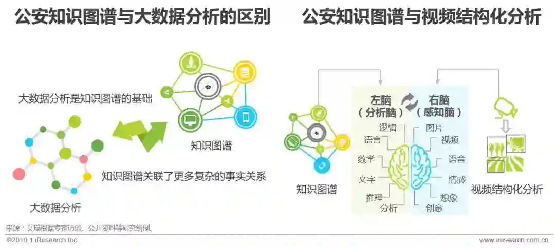 对于解决数据关联性问题,建设行业知识图谱成为了公安大数据应用的主流方向。知识图谱是解决数据梳理和组织成知识库的技术,是一种应用语义理解技术实现更高质量、可计算、计算机可理解的大数据结构,用于提高对数据、信息、情报的搜索查询能力。知识图谱与大数据分析和视频结构化分析同属于软件应用类服务,但存在着明显区别,视频结构化分析是通过计算机视觉技术,将非结构化的视频数据进行处理,变为机器可识别的数据集,是知识图谱上游的数据来源之一,可以说,视频结构化分析实现的是人眼及人右脑视觉区域所解决的部分问题,而知识图谱更像是人的左脑,通过对右脑存储信息的分析进行知识构建和调用;大数据分析实现的是数据结构化及关联,知识图谱是在大数据分析的基础上,通过语义理解将“点线面”的数据关联与事物现实中非简单指向性的复杂关系相联结,而形成的实用型认知应用。