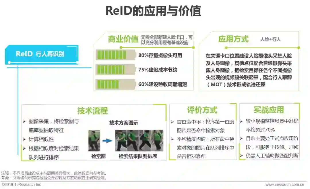 存量前端感知设备很难满足人脸识别所要求的架设高度、角度等需求,超过80%的摄像头需要换新或改造才能用于人脸识别,而这一般涉及长周期高投入的建设。2018年,AI+安防业内头部玩家开始重视将ReID(行人再识别)技术与人脸识别结合应用,充分利用现有设备和基础设施,实现跨摄像头对检索对象进行连续追踪和轨迹还原,增强数据的时空连续性。