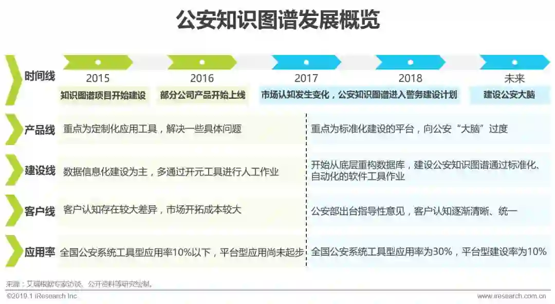 公安知识图谱建设起步较晚,2015年有少部分大数据分析公司开始尝试建设,初期以小而具体的工具软件形式出现,数据关联更多是通过人工打标签实现,效率低且价值有限,在全国范围的应用率仅为10%以下。经过技术发展和落地实践,以及企业内部技术标准统一和服务工具自动化迭代,自2017年开始市场认知产生变化,随着2018年公安部出台相关指导意见,各级公安系统对公安知识图谱的认知逐渐清晰、统一,更多基础层平台化的大型项目开始投入建设,已有项目维护和应用持续进行,2018年工具型公安知识图谱应用率为30%,平台型建设率达到10%,艾瑞将持续看好其发展。