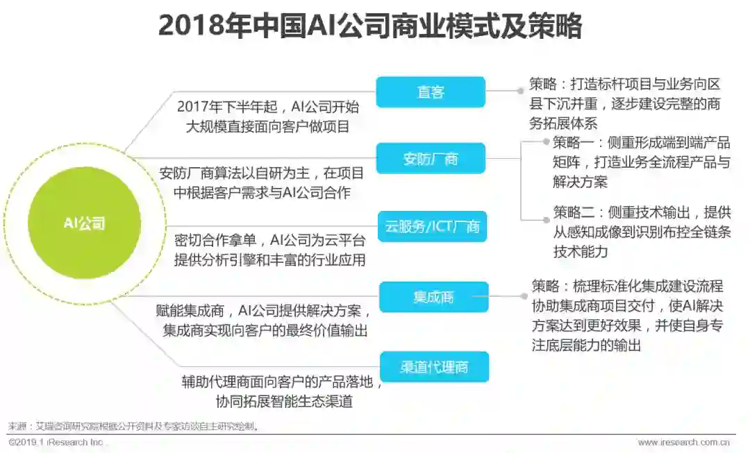 2018年AI公司直接面向客户的项目占比大幅提高,并更注重各类商业合作伙伴的拓展。在与安防厂商的合作方面,出现两类分化的策略,一种是逐渐打造自身全流程产品与解决方案业务闭环,这背后有两大动因,一是由于安防行业特性,硬件仍然具有市场入口地位,AI公司对设备和产品的重视提升,二是安防厂商在维持产业链核心地位的需求下对自研算法的投入和使用更强调,外采需求弱化;另一种是发挥技术优势,将从感知成像到识别布控全链条能力开放的技术输出策略。