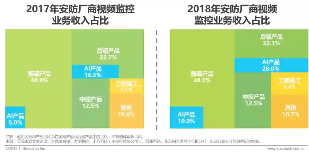 通过对头部安防厂商视频监控业务收入结构的研究,发现2017年和2018年人工智能开始真正落地安防场景,其中2018年更是飞速发展的一年。按前端产品、后端产品、中控产品、工程施工和其他划分的营收结构在这两年中基本没有发生变化,而AI产品的营收在前端营收占比中增长了100%,在后端营收占比中增长了70%,说明在符合已有市场需求结构的基础上,AI产品越来越受到市场的重视与欢迎,虽然整体占比还很小,但在公安部门“新建一批、利旧一批、淘汰一批”的准则下,2019年AI产品在安防厂商视频监控业务中的占比增速不会低于2018年。