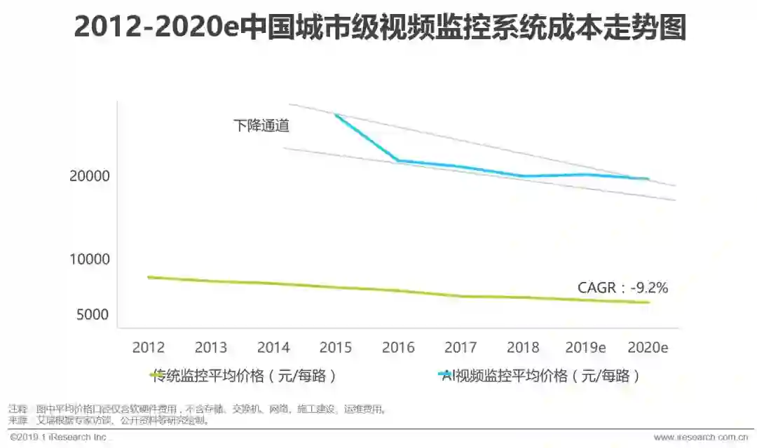 在国产化的作用下,传统监控(包括模拟摄像机、高清摄像机等)的平均价格下降,2012年至2018年CAGR为-9.2%,而AI视频监控(包括前端智能、后端智能等)应用大部分出现于2015年,其价格走势也进入了下降通道,到2018年平均价格约为2万元一路,近几年将保持平稳下降态势。