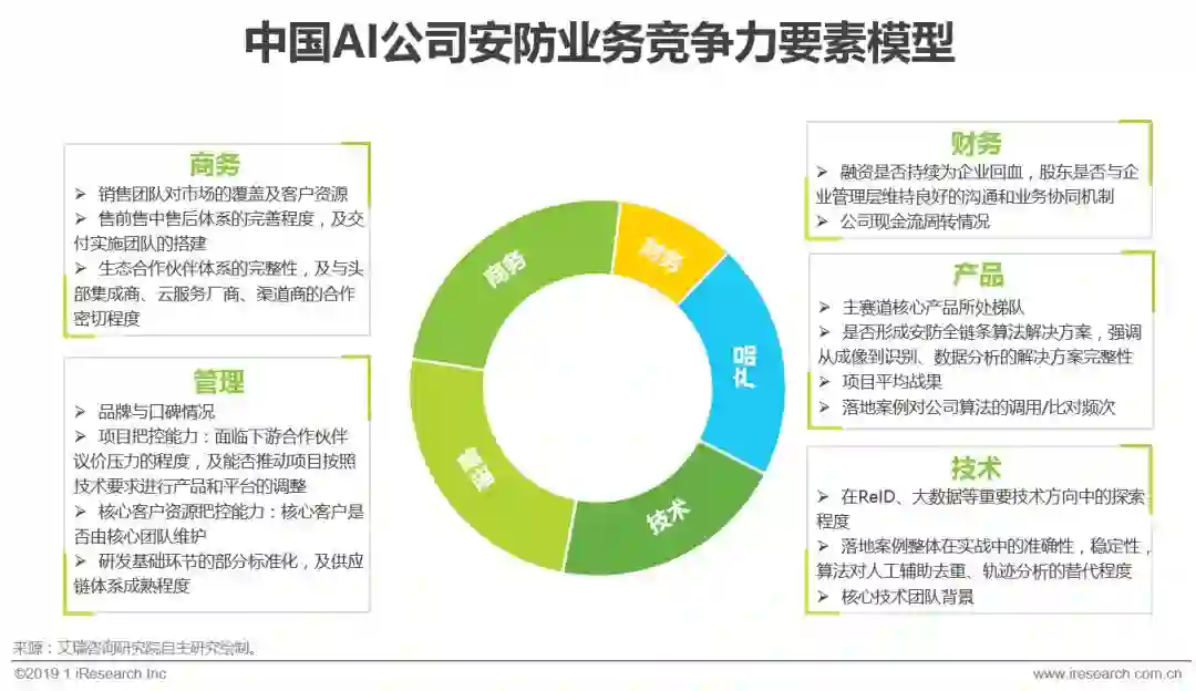 AI公司竞争力要素分析模型将AI+安防业务中各类因素汇集在一个简便的模型中,以此分析一个企业安防业务的基本发展态势。模型确定了竞争力的五种主要来源,即商务能力,管理能力,技术能力,产品能力及财务能力,市场关注或研究企业AI+安防业务竞争力时可从上述五个方面入手。
