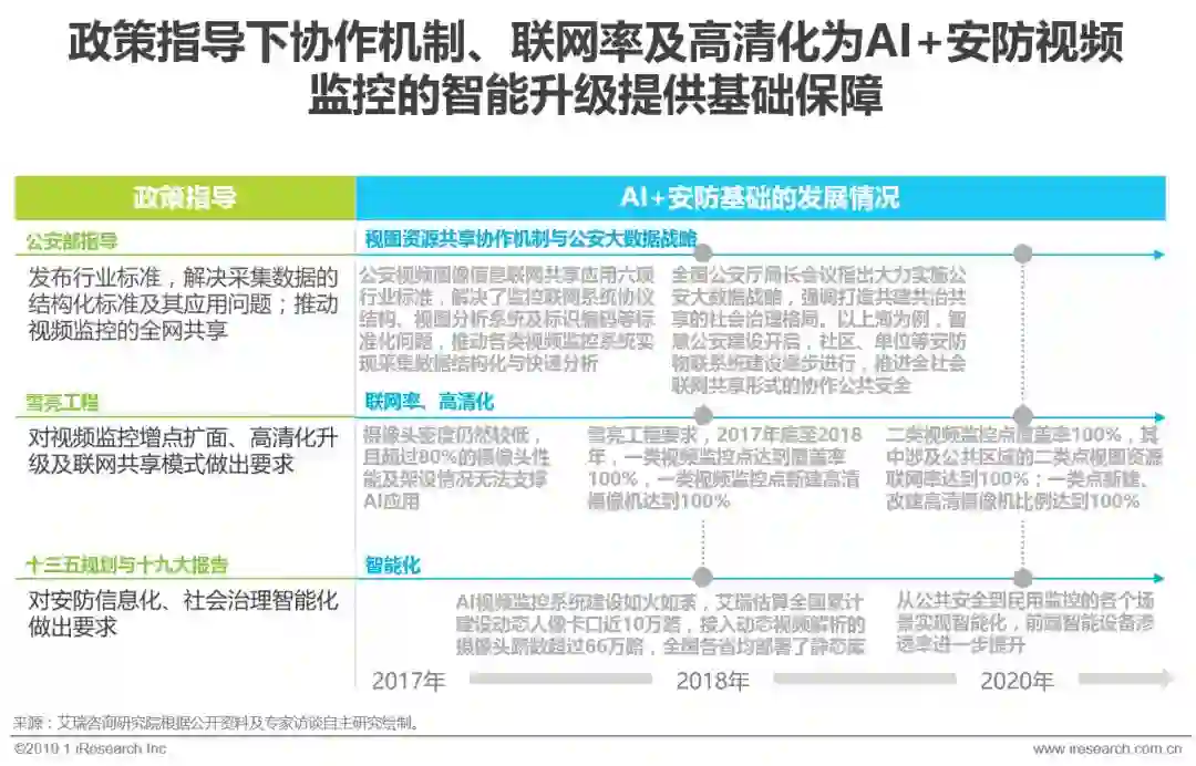 从2016年到2018年初,十三五规划、十九大报告、雪亮工程等不断强调提升安防视图资源共享协作及联网率、高清化建设。监控视频图像结构化数据的协作机制逐步建立,以及视频监控的清晰度和联网率得到快速发展,为监控智能升级奠定了较好的基础条件,使AI+安防视频监控得到较快推进,预计2020年将实现从公共安全到民用监控的各个场景实现智能化。