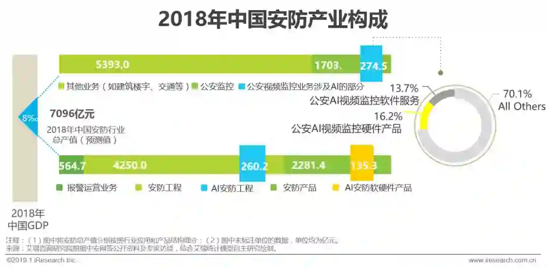 2018年中国整体安防行业产值约为7096亿元,按照行业应用来看,公安监控业务约1703亿元,其中AI软硬件及相关建设费用可达到274.5亿元(软件部分约37.7亿元,硬件部分约44.4亿元,相关配套设施与工程等部分约192.5亿元),目前试点类项目较多,软件部分受到一定程度的预算压缩,随着大规模动态识别项目的建设,这种情况可能得到改善。按照业务构成看,AI类项目收入约共计395.5亿元,其中工程部分约260.2亿元,软硬件产品部分约135.3亿元。