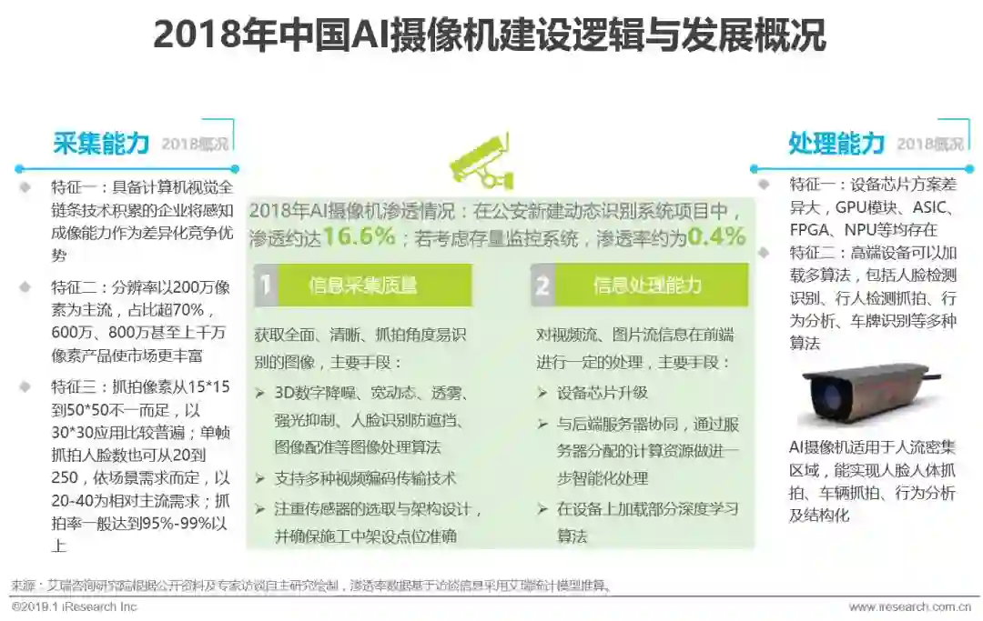 前文提及,安防人脸识别的实现大多需要新建或改造现存前端摄像机,简单来看,人脸检测、抓拍乃至比对等人脸识别算法可由AI摄像机在感知节点实现,或由高清网络摄像机配合后端服务器完成。2018年市场较为理性,从铺设速度看,AI摄像机在公安动态识别系统项目中渗透约达到16.6%,而若考虑全国近2300万路现存公安监控摄像头,则渗透率约0.4%,从设备能力看,符合应用场景可用指标为核心准则。
