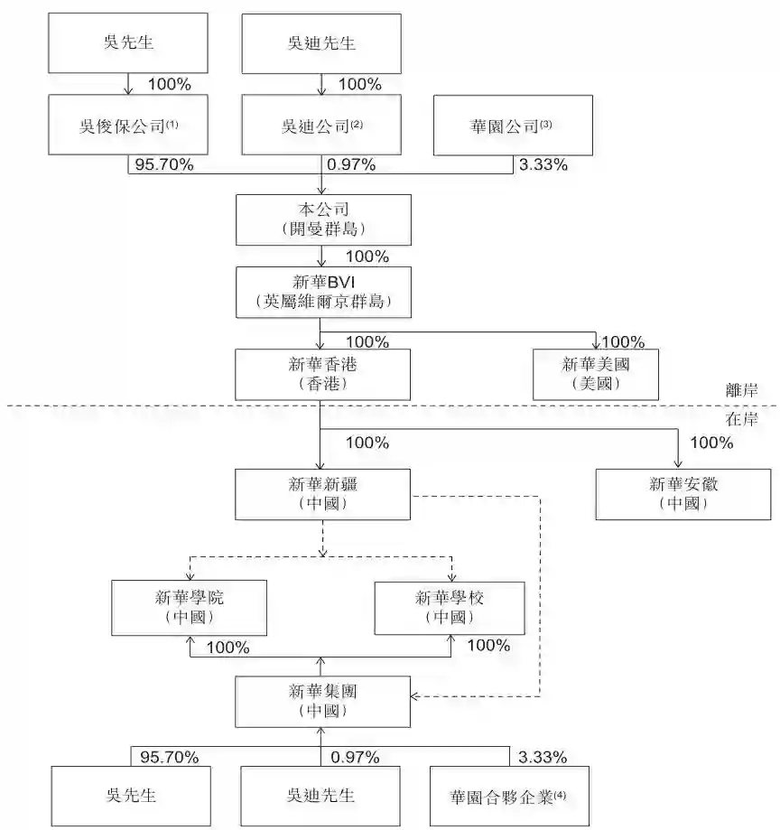 据招股书显示,新华教育创始人吴俊保持股达95.7%,其吴先生的儿子持股0.97%,合伙企业华园公司持股3.33%。
