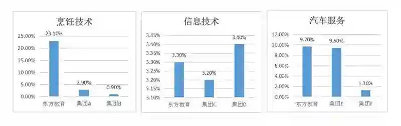 中国的烹饪职业技能教育市场相对集中,前三份额约为26.9%,东方教育占据23.1%;信息技术及互联网技术职业技能教育市场相对分散,东方站占有3.4%;汽车服务职业技能教育相对集中,前三占有20.5%的市场份额,东方为9.7%的市场份额。