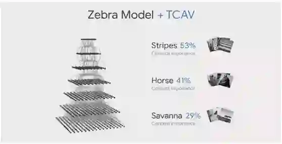 比如,一个训练有素的模型能够检测图像中动物是否是斑马,而TCAV可以帮助我们理解哪些变量在识别图像时发挥了作用,以及各自发挥了多大的重要性,因它对我们理解模型预测原理帮助很大。由结果可见,在各项概念中,“条纹”(Stripes)占据的权重最高,“马的形体”(Horse)次之,“草原背景”(Savanna)的权重最低,但也有29%。
