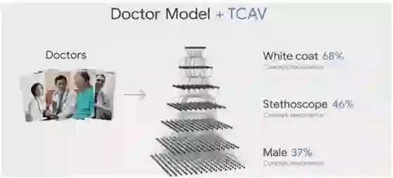 而 TCAV 的这一功能被用于算法纠偏非常合适,当我们把它的这项能力转移到涉及社会现实的识别模型上时,就可以清晰地判定该模型是否涉及歧视。比如,一个用于识别医生图像的算法,由TCAV的结果可见,其高权重的识别概念包括“白色衣服”、“听诊器”以及“男性”等。前两个影响因素是正确的,但关于性别的判断则意味着模型出了偏见需要通过进一步训练进行纠偏。