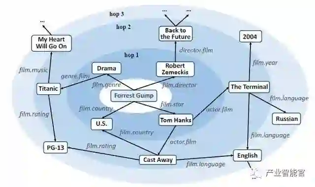 下图展示了用户兴趣在知识图谱上扩散的过程。以一个用户看过的“Forrest Gump”为中心,用户的兴趣沿着关系边可以逐跳向外扩展,并在扩展过程中兴趣强度逐渐衰减。