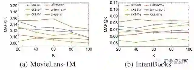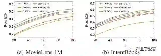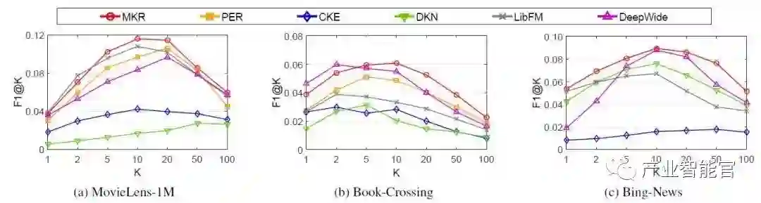 MKR在电影、图书和新闻推荐上也取得了不错的效果,其F1@K指标在绝大多数情况下都超过了baseline方法: