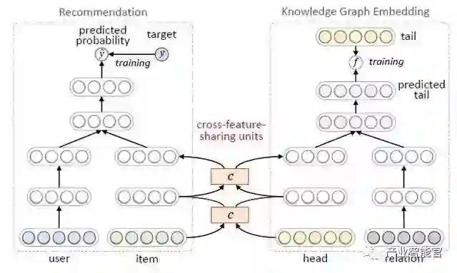 MKR[4]的模型框架如下,其中左侧是推荐任务,右侧是知识图谱特征学习任务。推荐部分使用用户和物品的特征表示作为输入,预测的点击概率作为输出。知识图谱特征学习部分使用一个三元组的头结点和关系表示作为输入,预测的尾节点表示作为输出。