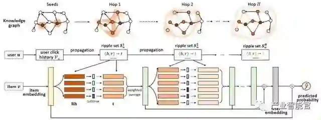 Ripple的中文翻译为“水波”,顾名思义,Ripple Network模拟了用户兴趣在知识图谱上的传播过程,整个过程类似于水波的传播: