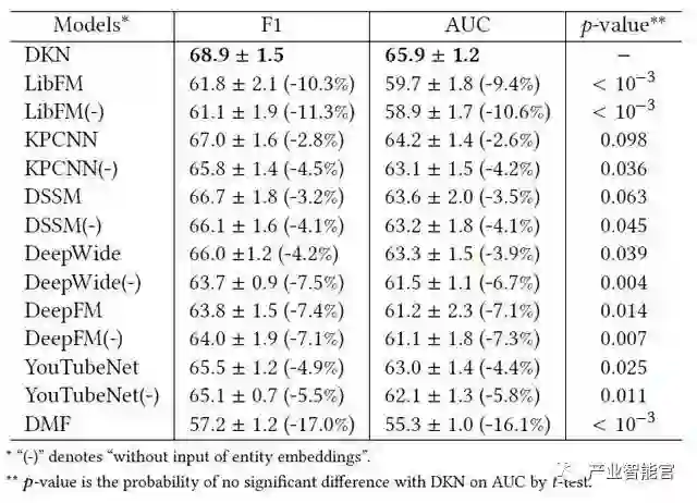 该模型在新闻推荐上取得了很好的效果:DKN取得了0.689的F1值和0.659的AUC值,并在p=0.1水平上比其它方法取得了显著的提升。