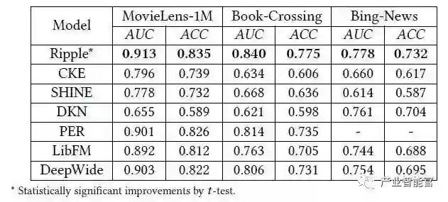 类似于CKE,我们在该损失函数上训练即可得到物品向量和实体向量。需要注意的是,Ripple Network中没有对用户直接使用向量进行刻画,而是用用户点击过的物品的向量集合作为其特征。Ripple Network在电影、图书和新闻的点击率预测上取得了非常好的效果: