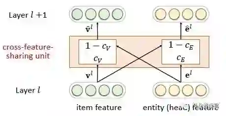 由于推荐系统中的物品和知识图谱中的实体存在重合,所以两个任务并非相互独立。我们在两个任务中设计了交叉特征共享单元(cross-feature-sharing units)作为两者的连接纽带。