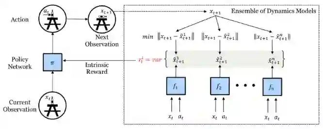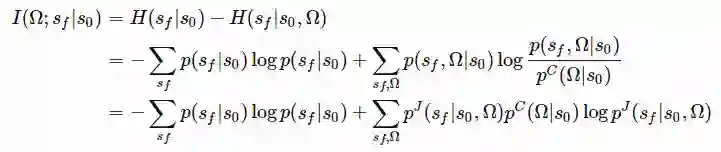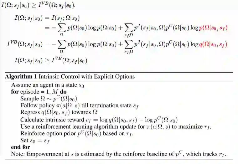 然而,这种探索仍然受到限制,因为自引导法带来的不确定性完全依赖于训练数据。在训练数据中注入一些独立于数据的先验信息会更好一些。“嘈杂”的先验信息有利于智能体在奖励稀疏时继续探索。这种在自举DQN中加入随机先验信息以便更好进行探索的算法(2018年论文《Randomized Prior Functions for Deep Reinforcement Learning》提出)依赖于贝叶斯线性回归。贝叶斯回归的核心思想是:通过对噪声数据进行训练,再加上一些随机正则化项,生成后验样本。θ 为 Q 函数参数, 为目标函数参数,使用随机先验函数 p 的损失函数可写成下式: 6 变分选择智能体的动作选择其实是带有终止条件的策略。搜索空间中存在大量独立于智能体本身的选择。明确地将内在选择纳入模型建立阶段,可以使智能体探索后获得内在奖励。VIC(简称为“变分内在控制”,2017年论文《Variational Intrinsic Control》提出)以选择建模和学习限定的策略为基础,是一个为智能体提供内在探索附加奖励的框架。Ω表示从开始 到结束 的选项。环境概率分布 表示给定启动状态 时选项Ω终止的位置。可控性分布 表示可以从中取样的选项的概率分布。根据定义有 。当选择选项时,希望实现以下两个目标:
