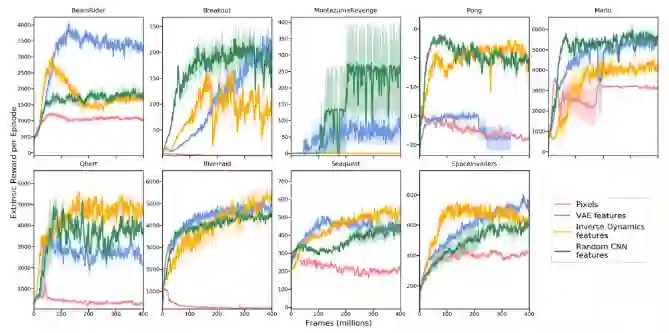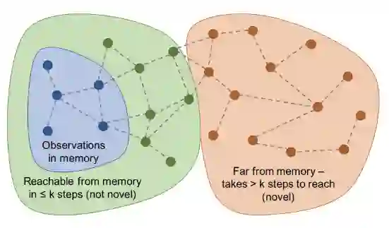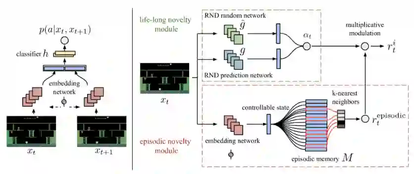 但是,如果预测的任务与环境动态变化无关呢?事实证明,当针对随机任务做预测时,会帮助提高模型探索的能力。定向展开强化动作选择(DORA,2018年论文《DORA The Explorer: Directed Outreaching Reinforcement Action-Selection》提出)是一个新颖的框架,它基于新引入的、独立于任务的MDP探索信号。DORA依赖于两个并行的MDP:一个是原始任务型MDP;另一个是相同结构的MDP,但是没有附加奖励:每个状态-动作对都被设计为0。第二个MDP学习到的 Q 值称为 E 值。如果模型不能完全预测 E 值为零,那就认为它仍然缺少信息。初始化时 E 值被赋值为1。这种正向的初始化可以鼓励智能体进行针对性探索,更好地预测 E 值。具有高 E 值估计的状态-动作对虽然还没有收集到足够的信息,但至少不足以排除它们具有高 E值。在某种程度上,E 值的对数可以看作是访问计数器的泛化。当用神经网络对 E 值进行函数逼近时,加入另一个头部值来预测 E,并且只需将其预测为零。给定预测的 E 值 ,探索附加奖励记作 。与DORA类似,随机网络蒸馏(RND;2018年论文《Exploration by Random Network Distillation》提出)引入独立于主任务的预测任务。RND的探索附加奖励定义为神经网络 对观测特征的预测误差,其中观测特征由随机初始化的神经网络 产生。此想法来源是给定一个新状态,如果智能体多次经历相似的状态,那么会更容易预测新状态,因此误差更小。探索附加奖励记作 。图8: 随机网络蒸馏(RND)的内在奖励机制。特征 由固定的随机神经网络生成(图片来源:OpenAI博客:基于预测奖励的强化学习)RND实验中有两项因素至关重要:1. 非截断性的设置会产生更好的探索效果,尤其是在不使用任何外在奖励的情况下。这意味着智能体获得的回报不会在“游戏结束”时被截断,内在奖励可以跨越多个状态。2. 标准化很重要,因为给定一个随机神经网络作为预测目标,奖励的规模将很难调整。内在奖励通过除以内在奖励标准差的连续估计来实现归一化。RND设置很好地解决了硬探索问题。例如,最大限度地提高RND的探索附加奖励后,智能体在蒙特祖玛复仇游戏中可以找到超过一半的房间数。(3)物理性质与模拟器中的游戏不同,在机器人领域等某些强化学习应用中,需要智能体理解物理世界中的对象并进行直觉推理。一些预测任务要求智能体与环境进行一系列交互后,观察相应的结果,例如估计某些物理隐藏属性(例如混乱、分歧等)。受这些想法启发,2017年论文《Learning to Perform Physics Experiments via Deep Reinforcement Learning》发现深度强化学习中的智能体可以学习进行必要的探索以发现这些隐藏属性。他们设置了以下两个实验:实验1:立方体重量问题——智能体必须与立方体交互并推断出哪个立方体更重。实验2:塔问题——智能体需要通过击倒一座塔来推断它由多少个刚体组成。实验中的智能体首先经历一个探索阶段,与环境交互并收集信息。一旦探索阶段结束,要求智能体输出一个标签化动作来回答问题。如果答案是正确的,则为智能体分配正奖励;否则分配负奖励。因为获得正确答案需要智能体与场景中的物体进行大量交互,所以智能体必须学会高效地搜索,以发现物理隐藏属性,最终找到正确答案。这样自然而然地进行了探索。在他们的实验中,智能体能够在两个任务中学习,其性能随任务难度而变化。本研究并未通过物理预测任务为内在附加奖励提供另一项学习任务相关的外在奖励,而是侧重智能体完成探索任务本身获得的外在奖励。这种通过预测环境中隐藏的物理特性来鼓励智能体进行探索行为的方式非常具有潜力。 4 基于记忆的探索基于奖励的探索有几个缺点:函数逼近速度慢;探索附加的奖励不稳定;知识衰退,当环境状态不再新颖,就无法及时提供内在的奖励信号。接下来要介绍的方法是依靠外部记忆来改善上述附加奖励探索的缺陷。1、情景记忆如上所述,RND在非截断性的环境下效果更佳,这意味着预测知识在多个事件中逐渐积累。“永不放弃”探索策略(NGU;2020年论文《Never Give Up: Learning Directed Exploration Strategies》提出)与新颖模块结合,其中RND模块可使智能体保持永久的好奇心,使其在单一事件中快速适应环境。准确地说,NGU中的内在奖励包括来自两个模块的两项探索附加奖励,它们分别是在一个事件内以及多个事件中。事件新颖模块提供每个事件的短期奖励。短期奖励包含事件存储单元M、可动态调整大小的基于时间间隔的存储单元以及IDF(逆动态特征)嵌入函数ϕ,与ICM中的特征编码相同。1)在每一步将当前的状态嵌入函数 添加到 M 中。2)通过比较当前观测值与M中存储内容的相似程度来确定具体的内在附加奖励。相似度越低会导致附加奖励越高,可用下式进行表示。其中 K(x,y)是衡量两个样本之间距离的核函数。 是根据K(.,.)从M中得到的k个最近邻集。c是一个较小的常数值,来保证分母非零。本文将 K(x,y)设置为反向核函数:其中d(.,.)是两个样本之间的欧几里德距离, 是针对更优鲁棒性的第k个最邻近项求得的欧几里德距离平方的平均值,ϵ是一个小常数。图9:NGU的嵌入功能(左)和奖励生成器(右)的体系结构(图片来源:2020年论文《Never Give Up: Learning Directed Exploration Strategies》)长期跨事件新颖度依赖于固定新颖模块中的RND预测误差。探索附加奖励是 ,其中 和 是RND误差 的平均值和标准差。然而,RND论文的结论指出:“我们发现,RND