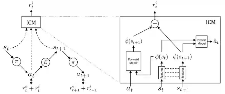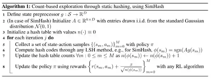 论文《How can we define intrinsic motivation?》中提到,这种内在奖励在某种程度上受到心理学的内在动机的启发。好奇心驱使的探索可能是儿童成长和学习的重要方式。换句话说,探索活动在人的潜意识中应该有内在的奖励。内在奖励可能与好奇心、惊喜、熟悉程度以及其他许多因素有关。同样的思想也可以应用到强化学习算法中。在下面的章节中,基于附加奖励的探索奖励方法大致分为两类:一是发现全新的状态,二是提高智能体对环境的认知。1、基于计数的探索策略如果将状态的新颖程度作为内在奖励的条件,那就需要寻找一种方法来衡量当前状态是新颖的还是经常出现的。一种直观的方法是统计一个状态出现的次数,并相应地分配附加奖励。与经常出现的状态相比,附加奖励会引导智能体选择那些很少受访问的状态,这被称为基于计数的探索方法。引入经验计算函数 ,该函数可以不断记录序列 中状态 s 的实际被访问次数。但是不能将其直接用在探索过程中,因为大多数状态的经验计算函数值为0,并且整个状态空间通常是连续或者高维的。我们首先需要对大多数状态进行非零计数。(1)基于密度模型的计数方法2016年论文《Unifying Count-Based Exploration and Intrinsic Motivation》利用密度模型估计状态的访问频率,并利用一种新算法从该密度模型中推导出伪计数。首先在状态空间中定义一个条件概率 ,表示在前 n 个状态是 的情况下,第 n+1 个状态是 s 的概率。为了从经验上衡量这一点,我们可以简单使用 。给出状态 s 的重编码概率 定义:当观察到s的新状态出现,密度模型分配给状态 s 的概率。为了更好地调整密度模型,本文引入了两个概念:伪计数函数 和伪计数总量 。它们被用来模拟经验计数函数,因此有如下计算公式: 和 之间的关系要求密度模型正向学习,即对于所有的 和 ,要求 。换言之,在观察到 s 的一个实例后,密度模型对该 s 的预测概率也要相应地增加。除了需要正向学习外,密度模型还要利用非随机化的经验状态数据,进行在线训练,由此可以得到 。求解上述线性系统后,可由 和 计算伪计数:或者通过预测增益估计(PG):基于计数的内在附加奖励的常见选择是 (如MBIE-EB;2008年论文《An analysis of model-based Interval Estimation for Markov DecisionProcesses》)。基于伪计数的探索附加奖励的形式类似于 。2016年论文《Unifying Count-Based Exploration and Intrinsic Motivation》中的实验采用简单的上下文树切换(CTS)密度模型来估计伪计数。CTS模型将二维图像作为输入,并根据位置相关的 L 形滤波器的乘积为其分配一个概率,其中每个滤波器的预测是由在之前图像上训练的CTS算法给出。CTS模型虽然简单,但在表达能力、可扩展性和数据效率方面有一定的限制。在后续的论文中,2017年论文《Count-Based Exploration with Neural Density Models》将训练的像素级卷积神经网络(2016年论文《Conditional Image Generation with PixelCNN Decoders》)作为密度模型改进了该方法。如2018年论文《Curiosity-Driven Experience Prioritization via Density Estimation》中所述,密度模型也可以是高斯混合模型(GMM)。他们使用变分GMM估计轨迹密度(例如一系列连贯的状态序列)及其预测概率,来指导离线策略环境中经验回放中的样本优先级。(2)哈希编码后再计数另一种对高维状态计数的方法是将状态映射到哈希码中,使状态的出现具备可追踪性(2017年论文《Exploration: A Study of Count-Based Exploration for Deep Reinforcement Learning》)。状态空间用哈希函数 离散化。将探索附加奖励 添加到奖励函数中,定义为 ,其中 N(ϕ(s)) 是 ϕ(s) 出现的经验计数。论文《Exploration: A Study of Count-Based Exploration for Deep Reinforcement Learning》中建议使用局部敏感哈希(LSH)算法将连续的高维数据转换为离散的哈希码。LSH是一类流行的哈希函数,其根据某种相似性度量方法来查询最邻近的点。如果哈希映射x↦h(x)保留了数据点之间的距离信息,封闭向量就会获得相似的哈希值,而散列向量获得不同的哈希值,那这个映射方案就是局部敏感的。(请参阅 LSH 如何用于改进Transformer模型。)SimHash是一种计算效率很高的LSH算法,它通过角距离测量相似度:其中 是一个矩阵,每一项都相互独立,并服从标准高斯分布, 是可选的预处理函数。二进制码的维度为k,控制状态空间离散化的粒度。k 越高,粒度越大,碰撞越少。图 2:利用SimHash对散列高维状态进行计数的探索算法对于高维图像,在原始像素级别应用 SimHash 算法可能不会取得良好效果。论文《Exploration: A Study of Count-Based Exploration for Deep Reinforcement Learning》中设计了自动编码器(AE),将其作为输入状态 s 来学习哈希编码。自动编码器有一个特殊的稠密层,该层由k 个 sigmoid 函数组成,作为中间隐藏层。将该层的 sigmoid 激活值 b(s) 进行二进制化,四舍五入到其最接近的二进制数 ⌊b(s)⌉∈ ,再将此二进制数作为状态 s 的二进制哈希码。n 个状态的 AE 损失包括重构损失和 sigmoid 激活函数的二进制近似损失两项:这种方法存在的一个问题是,不同的输入 可能会映射成相同的哈希码,但是自动编码器仍然会很好的重构它们。我们可以用哈希码 ⌊b(s)⌉ 替换瓶颈层 b(s),但是这样做,梯度不能通过round函数进行反向传播。 注入均匀噪声可以减轻这种影响,促使自动编码器学会扩大隐变量间的距离以抵消噪声。2、基于预测的探索策略第二类内在探索附加奖励用于奖励智能体