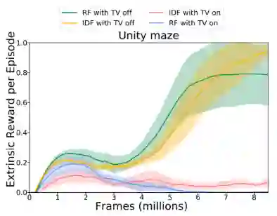 “电视加噪”问题源于2018年论文《Exploration by Random Network Distillation》中的一项实验。实验限定智能体通过观察新颖的画面就能获得奖励,如果播放的电视节目中加入了不可控和不可预测的随机噪声,就能够一直吸引智能体的注意。 该智能体会持续地从含有噪声的电视节目中获得新的奖励,但未能取得任何有意义的进步。图1:实验中,一个智能体因观察新颖的画面而获得奖励。如果迷宫中播放了加噪TC版影片,则会吸引智能体的注意力,使其停止在迷宫中移动(图片来源:OpenAI博客:“基于奖励的强化学习预测研究”) 3 内在奖励作为额外的探索奖励对于解决硬探索问题,一种常用的探索方法是用附加的奖励信号来增加环境奖励,鼓励智能体进行持续的探索。因此,策略的训练由两项组成, ,其中 是调整探索与利用之间平衡的超参数。