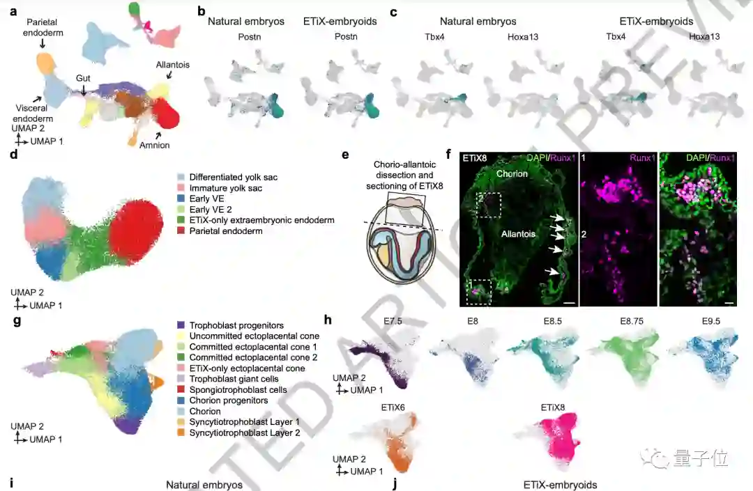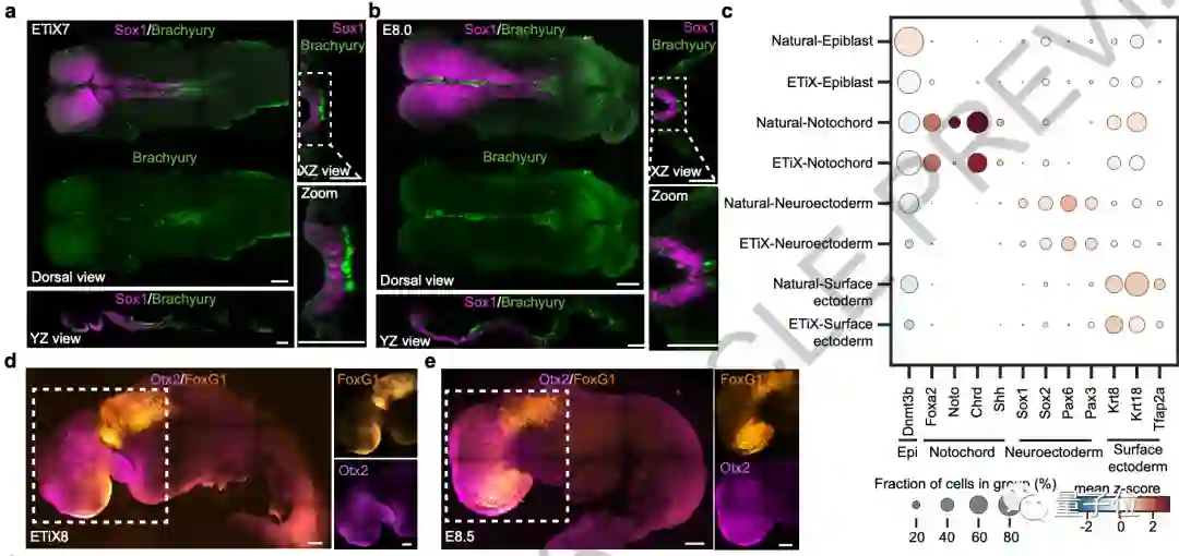 进一步的,他们还研究了这种人造胚胎的基因表达模式,发现与天然胚胎非常相似。