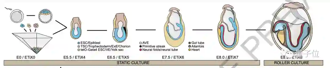 除此之外,还有一个跳动的心脏状结构,一个由神经管和体节组成的躯干,一个含有神经中胚层祖细胞的尾芽,一个肠管和原始生殖细胞。