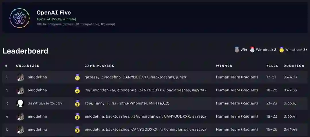 现在,三天时间过去了,比赛结果排行榜也在实时的发生着变化。从该排行榜来看,人类目前只赢了40场比赛,OpenAI Five的胜率高达99%!