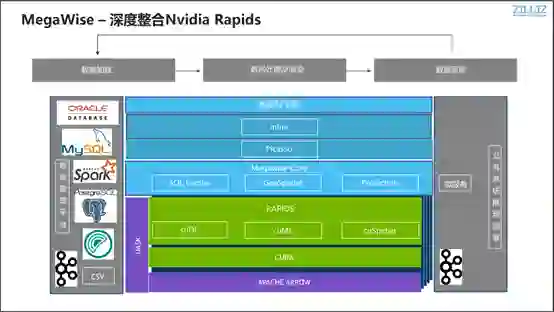 再让我们来看一下在数据现实的核心产品——MegaWise,是结构化数据处理的核心引擎,深度整合了Nvidia Rapids的数据科学平台。从图中可以看出产品是建构在Nvidia Rapids异构数据科学平台之上的,通过整合各种数据分析处理组件,实现了对时空数据的高性能分析,很好的支持了上层可视化交互平台。同时,自主研发的Picasso 图形渲染引擎,能够对数亿级别的时空信息进行秒级渲染并通过Inifi可视化分析平台为数据科学家提供了超大规模数据现实分析能力。