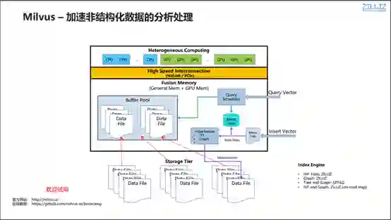 现在来介绍一下Milvus这款产品,是针对非结构化数据处理而设计的检索产品,可对到高维度、百亿级向量数据的进行秒级检索,能有效降低硬件成本(至少一个数量级)。通过异构计算的核心算法设计,能够在所有人工智能相关领域中使用,比如,人脸识别,语音识别,视频分析,文本分析等,能够为深度学习领域的推理部署进行性能提升和有效的成本控制。